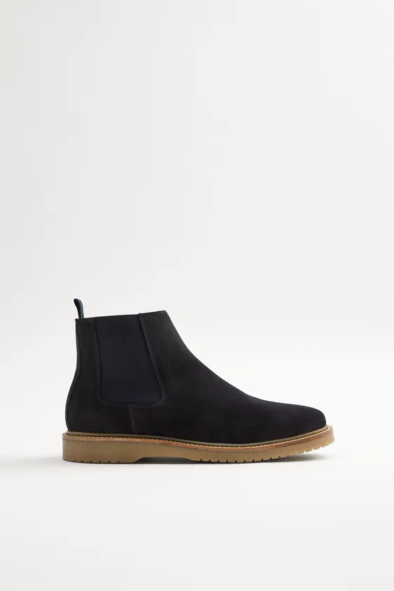 Questo modello di calzatura Zara è realizzato con una colorazione blu marino ed anche. con finitura in pelle scamosciata. Dotato di elastico laterale e tiretto per la facilità di calzata, ha soletta interna in pelle e la suola con cuciture a contrasto. La dentatura della gomma favorisce la presa sul terreno.